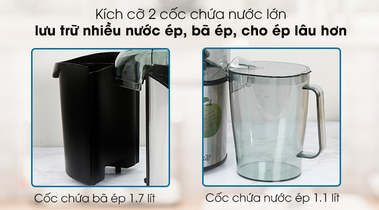 Cốc chứa nước ép đi kèm nắp đậy, tay cầm cho bạn bảo quản nước ép sạch sẽ, rót nước ép ra ly dễ dàng. Cốc chứa bã lớn đựng được nhiều bã ép, không cần đổ bã nhiều lần.