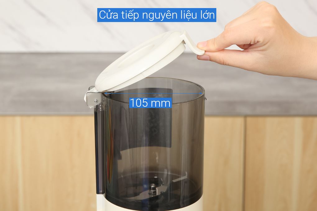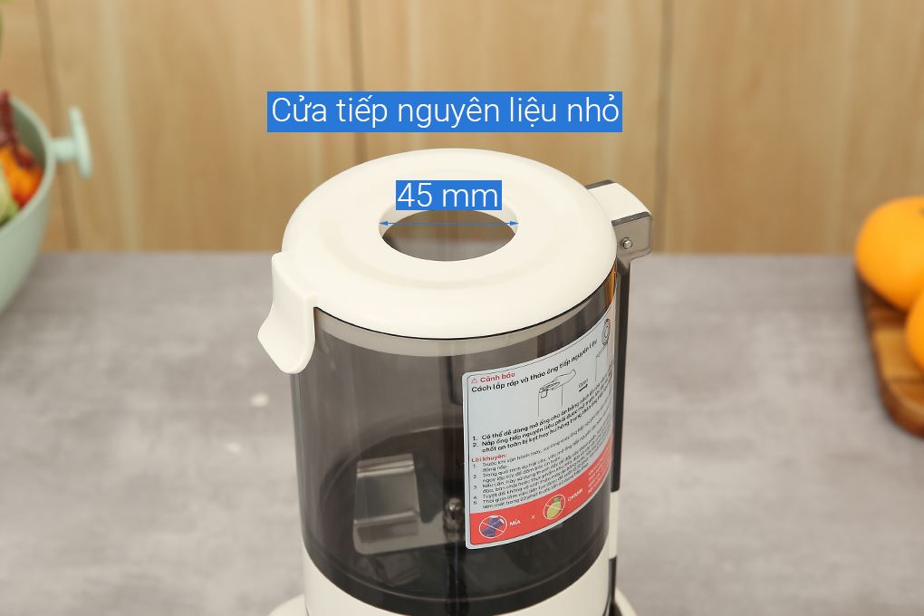 - Bên cạnh đó còn có ống tiếp nguyên liệu nhỏ đường kính 45 mm, phù hợp với các loại trái cây có kích thước nhỏ như nho, dâu, cà chua bi,...