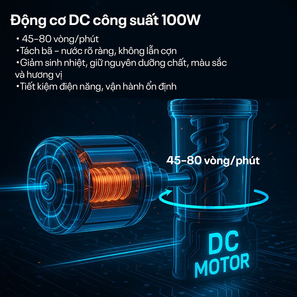 Máy ép FUJIHOME SJ06 sở hữu công suất 100W với động cơ DC mạnh mẽ, đủ sức ép các loại rau củ quả khác nhau mà vẫn tiết kiệm điện năng. Bảng điều khiển được thiết kế đơn giản với nút nhấn 3 chế độ tiện lợi: Bật, tắt và đảo chiều. Chức năng đảo chiều đặc biệt hữu ích khi nguyên liệu bị kẹt, giúp trục ép quay ngược lại để giải phóng, đảm bảo quá trình ép diễn ra liên tục.