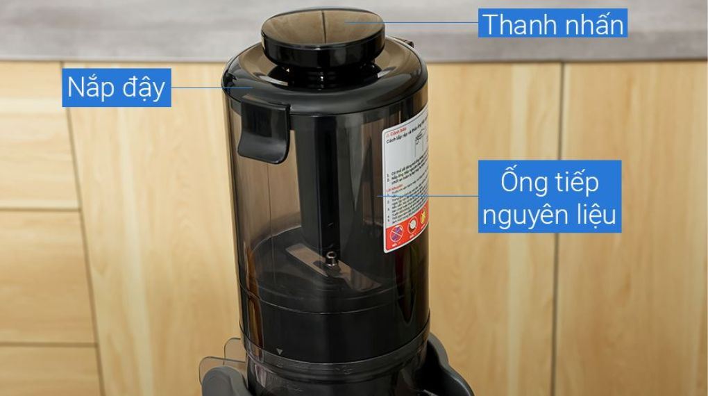 Bên cạnh đó, ống tiếp nguyên liệu có độ rộng lên đến 108 mm nên có thể dễ dàng ép nguyên liệu “nguyên trái” có kích thước vừa như: táo, lê, chà chua,... mà không cần phải tốn thời gian xử lý. Sản phẩm còn được trang bị cốc đựng nước ép dung tích 1 lít, đi kèm cốc chứa bã riêng biệt, giúp tách bã gọn gàng trong quá trình ép. Thiết kế này hỗ trợ việc rót, thưởng thức nước ép dễ dàng và thuận tiện hơn khi vệ sinh sau khi sử dụng.