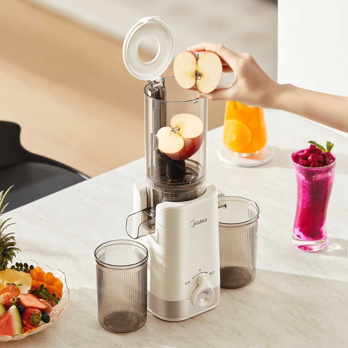 Điểm nhấn ấn tượng của chiếc máy ép Midea này chính là khả năng ép nguyên trái cực kỳ tiện lợi. Với đường kính ống tiếp nguyên liệu lớn lên đến 98mm, bạn có thể dễ dàng cho cả quả táo, cam hay lê vào mà không cần tốn thời gian cắt nhỏ. Điều này giúp giảm đáng kể công đoạn chuẩn bị, mang lại sự tiện lợi tối đa cho người dùng bận rộn.