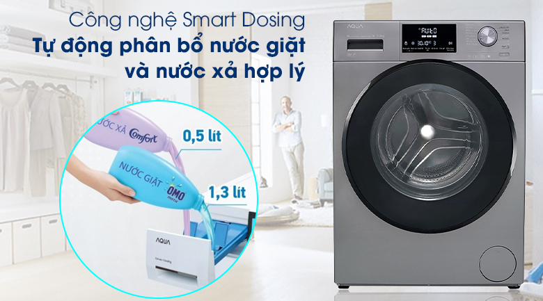 Chỉ cần đổ một lượng nước giặt (1.3 lít) và nước xả (0.5 lít) vào ngăn đựng, sau đó máy sẽ tự phân bổ lượng nước giặt và nước xả phù hợp với khối lượng quần áo trong lồng giặt. Tiết kiệm đáng kể lượng nước giặt, nước xả, bảo vệ làn da người dùng vì không phải thường xuyên rửa tay khi dính nước giặt hay nước xả.
