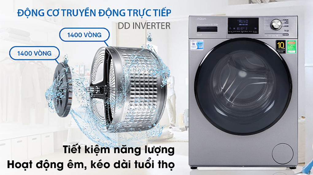 Máy giặt Aqua được trang bị động cơ truyền động trực tiếp DD Inverter giúp cho máy vận hành êm ái, cho tốc độ vắt cao hơn các mẫu máy giặt thông thường, giảm rung lắc và bền bỉ với thời gian. Kết hợp cùng công nghệ Inverter với khả năng tự điều chỉnh tần số điện áp đưa vào động cơ, từ đó giúp máy giặt hoạt động ổn định và tiết kiệm điện.