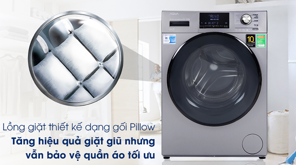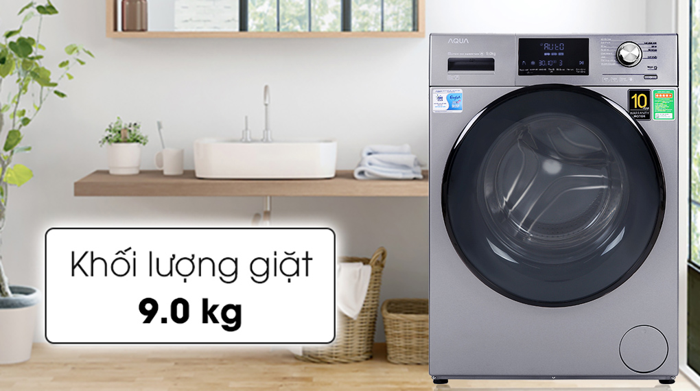 Máy giặt AQUA Inverter 9.0 KG AQD-DD900F S mang thiết kế hiện đại với gam màu xám sang trọng, hài hòa màu sắc với mặt cửa trước tiện lợi, cách bố trí bảng điều khiển dễ sử dụng, phù hợp với mọi không gian nội thất của nhà bạn. Khối lượng giặt 9 kg thích hợp với những gia đình có từ 3 - 5 thành viên.