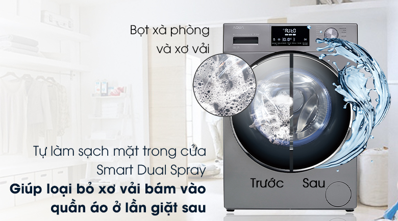 Đầu phun nước đôi (Smart Dual Spray) sẽ tự động phun theo từng đợt, giúp rửa sạch xơ vải, bọt nước giặt, bột giặt còn sót lại ở khu vực mặt cửa kính và vòng đệm cửa, đảm bảo luôn sạch sẽ sau mỗi lần giặt.