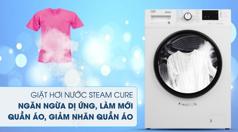 Máy giặt Beko Inverter 8 kg WCV8612XB0ST tích hợp tính năng giặt hơi nước SteamCure sẽ giúp loại bỏ tốt các loại vi khuẩn, tác nhân gây dị ứng bám trên da (được chứng nhận bởi Hiệp hội Dị ứng Anh Quốc), cũng như hạn chế được tình trạng xoắn rối và nếp nhăn của quần áo sau khi giặt.