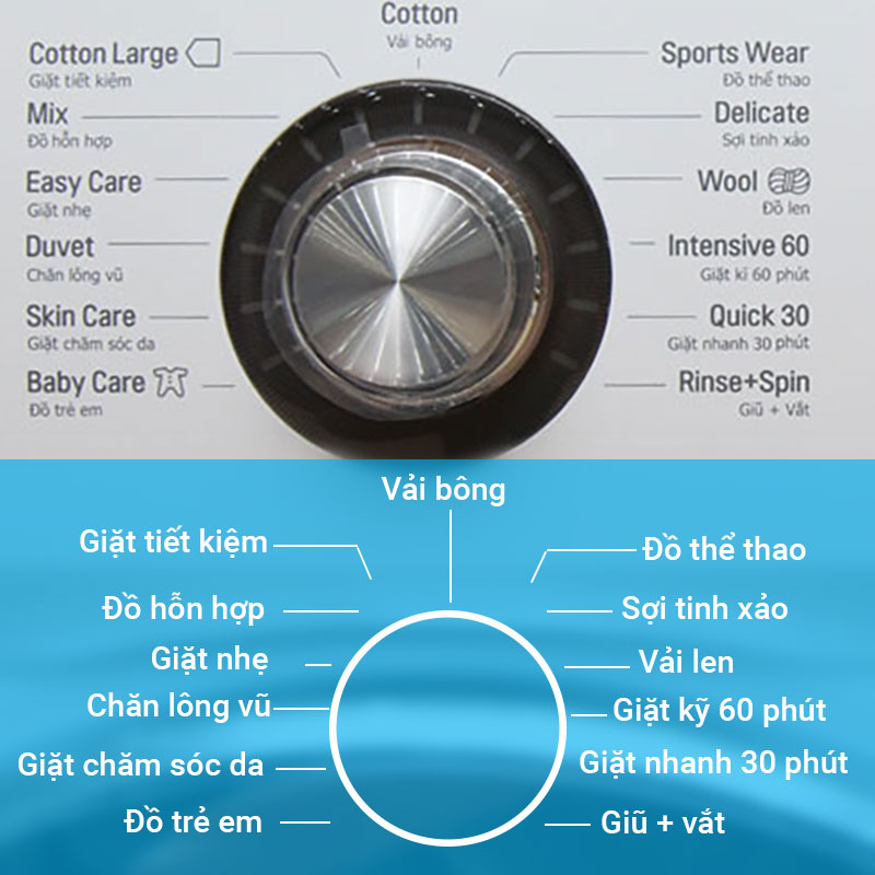Chế độ giặt với 6 chuyển động khác nhau là một chế độ hoàn toàn mới của máy giặt hiện nay. Bao gồm nhào trộn, nén, đảo, chà xát, quay và đập, những chế độ này mô phỏng theo bàn tay con người nhằm tạo sự chăm sóc sợi vải được tốt hơn.