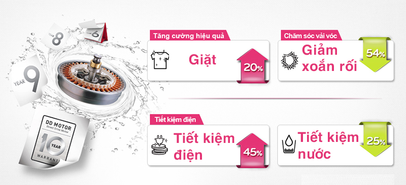 Máy giặt sấy LG WD-20600 được LG tự tin bảo hành tới 10 năm cho động cơ, đảm bảo chất lượng hoạt động bền bỉ. Thêm vào đó, động cơ vẫn hoạt động sau 5000 chu trình giặt và được chứng nhận bền bỉ trong 22 năm. Do vậy, người dùng hoàn toàn có thể an tâm khi sở hữu chiếc máy giặt này.