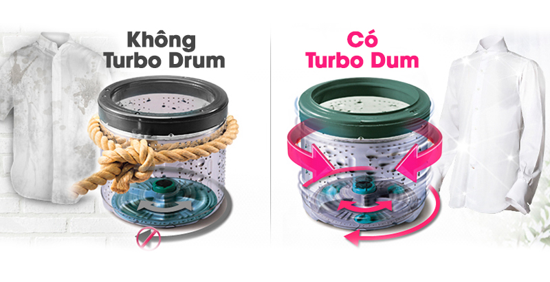 Máy giặt được trang bị công nghệ Turbo Drum, cho phép lồng giặt và mâm giặt quay ngược chiều nhau, giúp nâng cao hiệu quả giặt, đồng thời giảm độ xoắn rối quần áo sau khi giặt.
