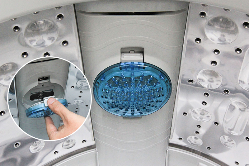 Đấm nước nằm giữa mâm giặt chính kết hợp với 3 mâm giặt phụ xung quanh sẽ tạo ra những luồng nước xoáy cực mạnh len lỏi vào từng sợi vải và cuốn đi mọi vết bẩn trên quần áo.