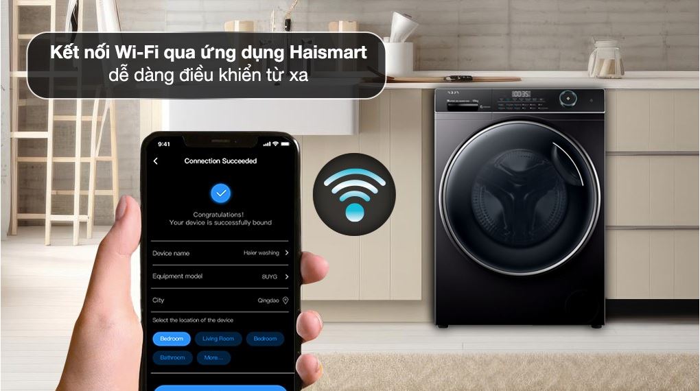 Kết nối Wi-Fi, điều khiển từ xa qua ứng dụng Haismart, cho phép theo dõi và cài đặt chương trình giặt ngay cả khi bạn không ở nhà.