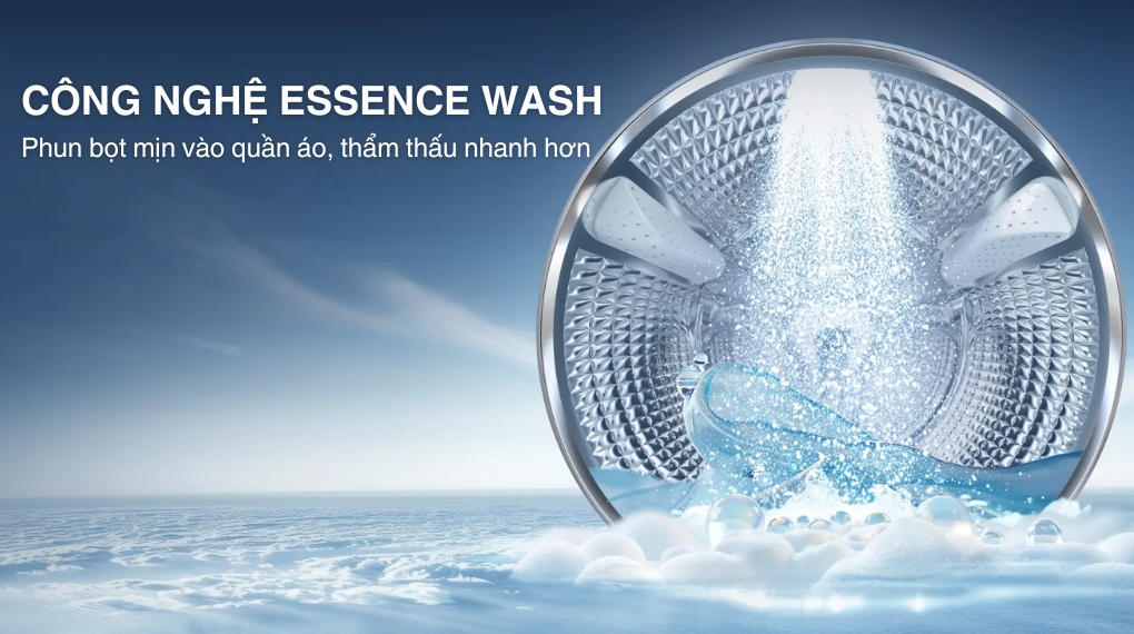 Essence Wash siêu bọt kép: tạo siêu bọt kép với khả năng đánh tan chất giặt tẩy mạnh mẽ, bọt mịn thẩm thấu sâu vào sợi vải, loại bỏ vết bẩn nhanh mà vẫn bảo vệ chất liệu.