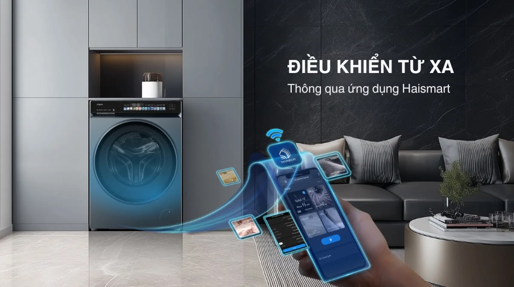 Kết nối Wi-Fi, điều khiển qua ứng dụng Haismart giúp người dùng có thể điều khiển và kiểm soát máy giặt từ ứng dụng được cài đặt trên thiết bị di động.