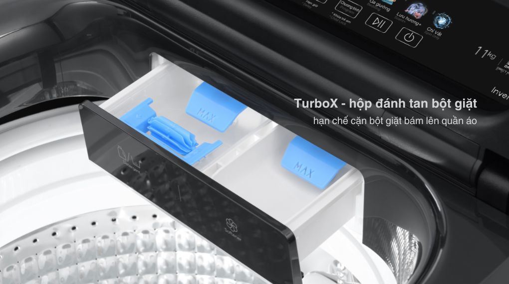 Hộp đánh tan bột giặt Turbo X là bộ phận giúp hòa tan bột giặt nhanh và đều hơn trước khi đưa vào lồng giặt. Khi máy hoạt động, nước và bột giặt được xoáy trộn mạnh trong hộp, hạn chế tình trạng bột giặt vón cục hoặc bám trực tiếp lên quần áo.