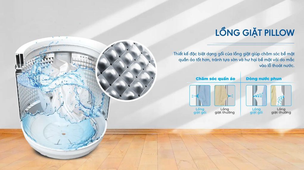 Lồng giặt Pillow là kiểu lồng giặt có bề mặt dạng gối với các lỗ thoát nước được bo tròn và gờ nổi mềm mại, giúp giảm ma sát lên sợi vải trong quá trình giặt. Vì vậy quần áo sẽ được bảo vệ tốt hơn, hạn chế sờn rách và xoắn rối, đồng thời nước dễ thẩm thấu sâu vào từng sợi vải để hỗ trợ làm sạch hiệu quả.