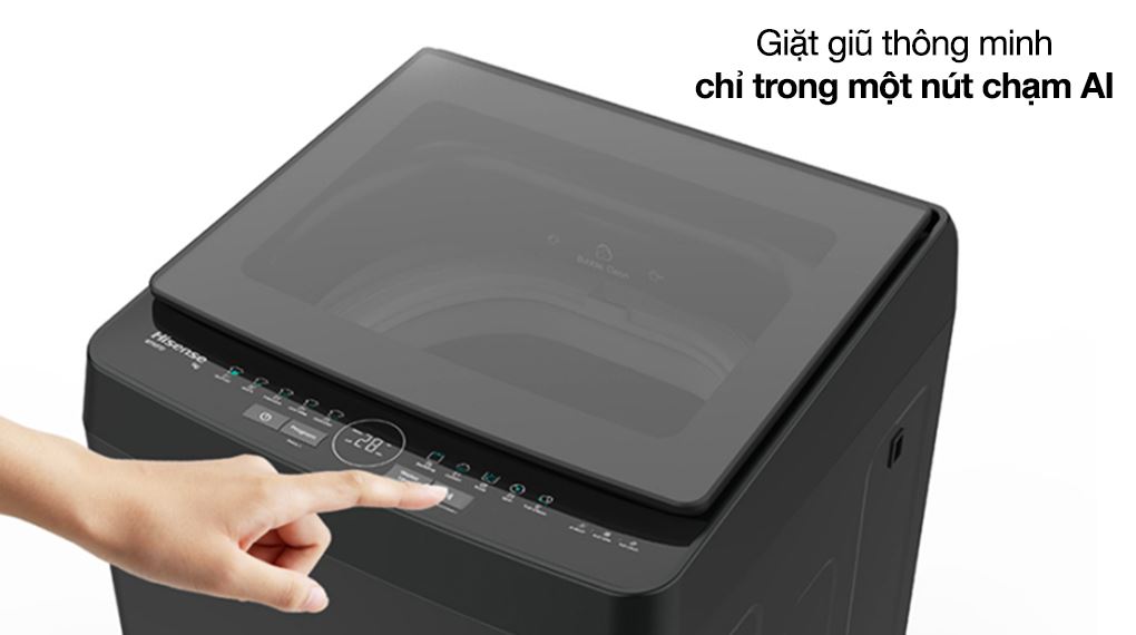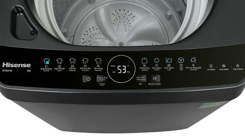 Máy giặt Hisense 8 kg WT80F30 được tích hợp tính năng giặt AI một chạm. Chỉ cần cho quần áo vào, máy sẽ tự động cân chỉnh thời gian và mực nước phù hợp với khối lượng đồ, giúp việc giặt giũ trở nên dễ dàng và nhanh chóng hơn.