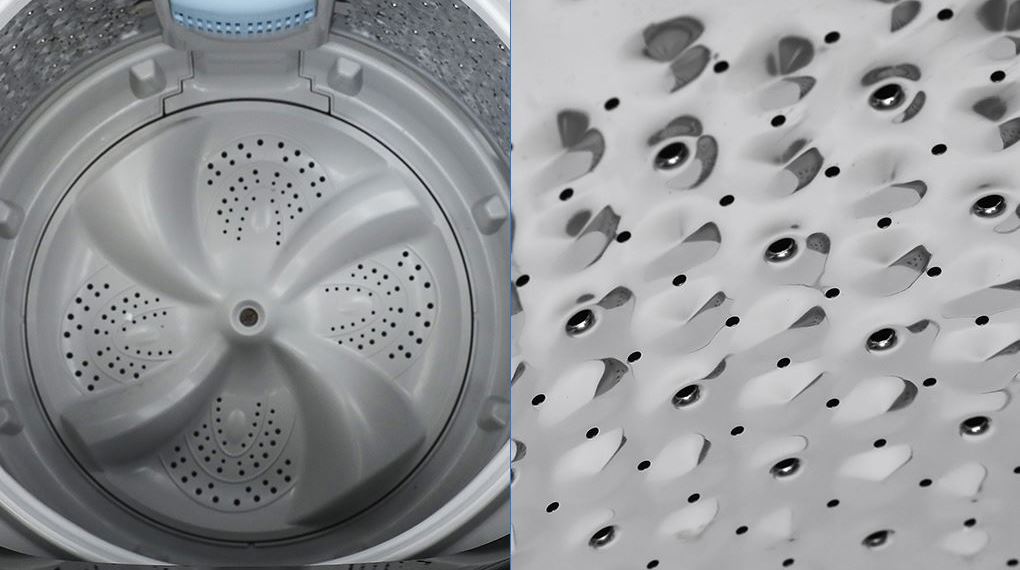 Lồng giặt bên trong máy có các gờ nổi hình ngôi sao hỗ trợ giảm ma sát trực tiếp với quần áo, đồng thời tạo nhiều điểm tiếp xúc để giặt sạch hiệu quả hơn mà vẫn bảo vệ sợi vải.