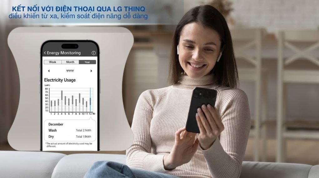 Ngoài ra, máy tích hợp tính năng kết nối Wifi qua ứng dụng LG ThinQ™, cho phép bạn điều khiển từ xa, hẹn giờ hoặc theo dõi tiến độ giặt hoặc mức sử dụng điện nan ngay trên điện thoại. Ứng dụng còn hỗ trợ chẩn đoán lỗi thông minh, giúp việc xử lý các vấn đề cơ bản trở nên nhanh chóng và chủ động.