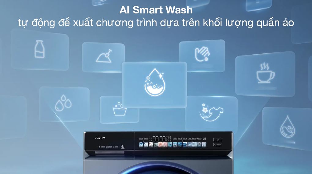 • AI Smart Wash tự động điều chỉnh chương trình giặt phù hợp với khối lượng và chất liệu quần áo.