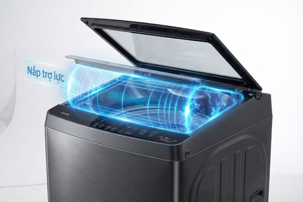 Máy giặt Toshiba Inverter 17 kg AW-T08DUH1800MV(MG) thuộc dòng cửa trên, lồng đứng nên thao tác cho đồ vào và lấy đồ ra khá thoải mái, không phải cúi người nhiều như lồng ngang. Vỏ máy bằng kim loại sơn tĩnh điện cho cảm giác chắc chắn, hạn chế trầy xước và dễ lau chùi khi bám bụi. Phần nắp làm từ kính chịu lực trong suốt, đóng mở nhẹ tay, có trợ lực giúp tránh tình trạng sập nắp đột ngột gây kẹt tay hay tạo tiếng ồn lớn.