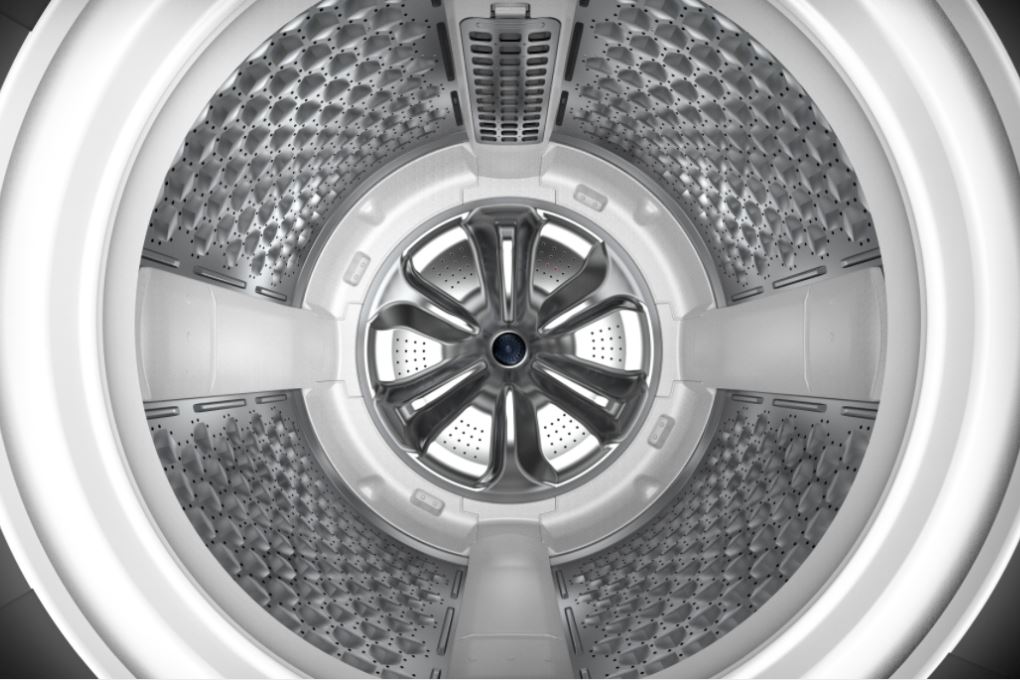 Lồng giặt làm từ thép không gỉ với bề mặt dạng ngôi sao pha lê, các gờ nổi được bo tròn giúp tăng ma sát khi giặt nhưng vẫn êm với sợi vải, hạn chế xù lông hay sờn rách khi dùng lâu dài.