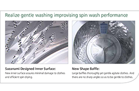 Lồng giặt Sazanami giúp giảm thiểu hư hại quần áoLồng giặt Sazanami, thiết kế mới của Panasonic là loại lồng giặt lí tưởng để loại bỏ hoàn toàn bụi bẩn bám trên quần áo. Mặt trong lồng giặt được thiết kế đặc biệt giúp giảm thiểu hư hại quần áo so với lồng giặt thông thường, đồng thời giúp quá trình quay vắt hiệu quả | Ion Bạc Kháng KhuẩnIon Bạc bao phủ giúp ngăn chặn sự phát triển của vi khuẩn trên quần áo tới 99.9%. Trong quá trình quay vắt, các Ion Bạc kháng khuẩn bao phủ và thấm sâu vào quần áo, giúp chặn đứng sự phát triển của vi khuẩn, Ion Bạc được lưu trữ trên vải sau khi giặt giúp ngăn chặn mùi khó chịu | Kĩ thuật giặt hiệu quả AquabeatLuồng nước 3 chiều luân chuyển tác động mạnh mẽ lên từng sợi vải giúp đánh tan mọi vết bẩn cứng đầu bám trên quần áo |