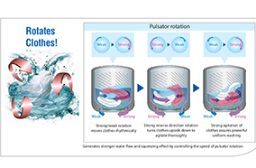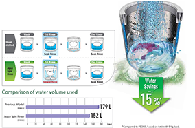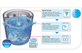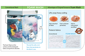 Cơ chế xả mớiKỹ thuật giặt Aquabeat giúp giảm lượng nước sử dụng trong suốt quá trình xả một cách hiệu quả. Quá trình xả là quá trình sử dụng nước nhiều nhất trong cả chu kì giặt. | Tính năng Foam WashMáy giặt Panasonic biến xà phòng trở thành một lớp bọt dày đặc có khả năng xóa tan vết bẩn hiệu quả sẽ thấm xuyên qua quần áo để tấn công các vết dầu mỡ và bụi bẩn bên trong sợ vải | Kỹ Thuật Luân Chuyển Luồng NướcHai luồng nước đối nghịch giúp nhào lộn quần áo trong lồng giặt máy giặt, giúp đồ được giặt sạch hơn |