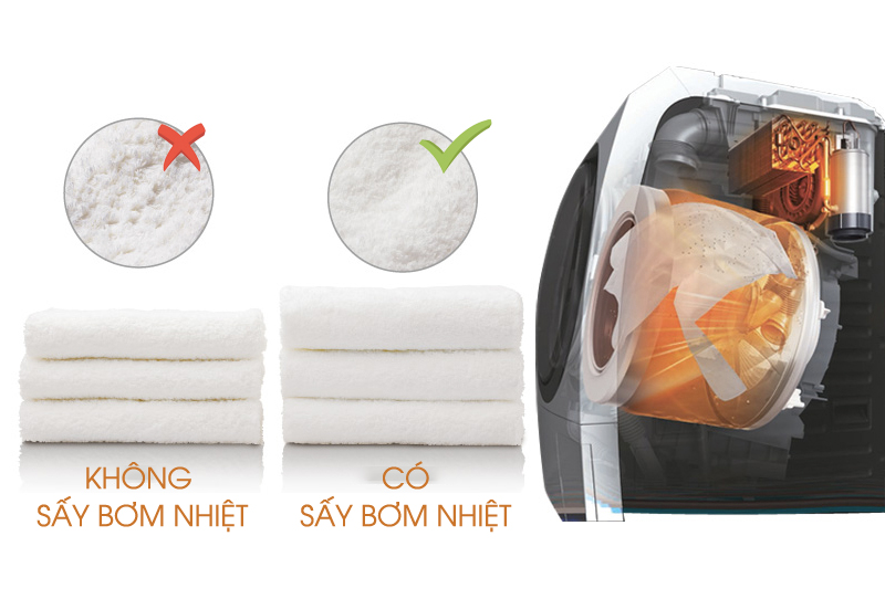 Máy giặt sấy Panasonic NA-VX93GLWVT còn có công nghệ sấy bơm nhiệt đặc biệt, sử dụng luồng khí khô và nóng khoảng 65 độ C để sấy khô áo quần. Nhờ nhiệt độ và công nghệ này, áo quần sẽ ít bị co và biến dạng, cũng như bị tổn hại hơn so với cách sấy thông thường.