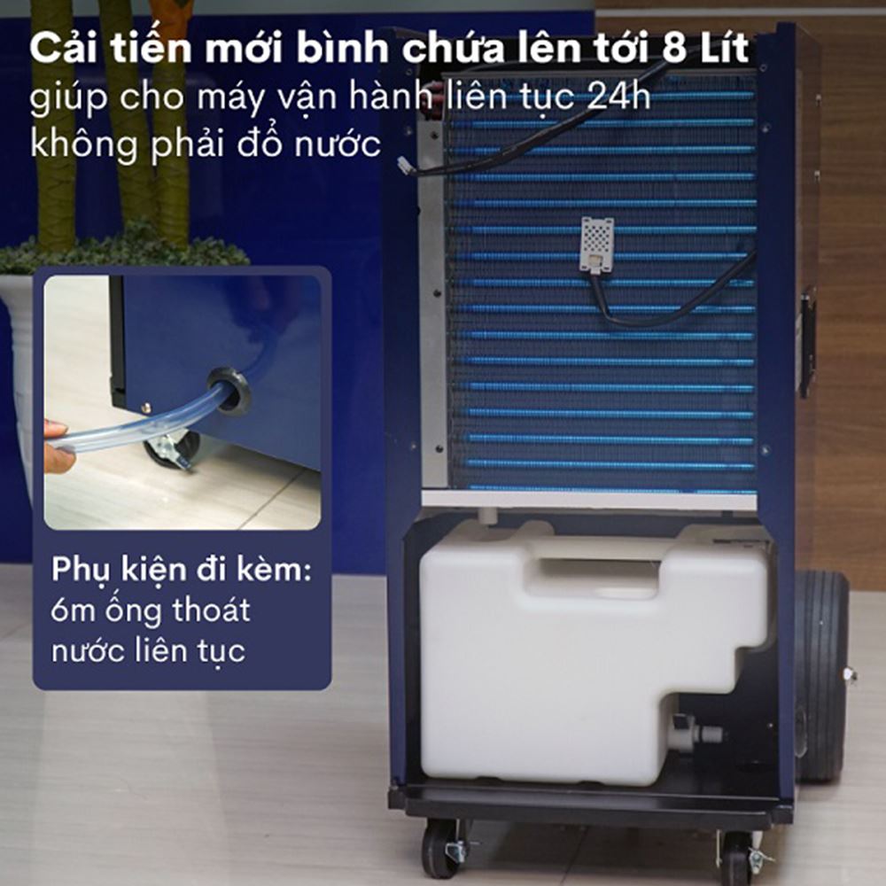 Nỗi lo phải thường xuyên đổ nước thải sẽ không còn nữa với Fujihaia DH70BL. Máy trang bị bình chứa nước dung tích lớn 8 lít, cho phép máy hoạt động liên tục trong thời gian dài mà không cần can thiệp. Đây là điểm cộng lớn, đặc biệt khi bạn sử dụng máy qua đêm hoặc trong những ngày nồm ẩm kéo dài.
