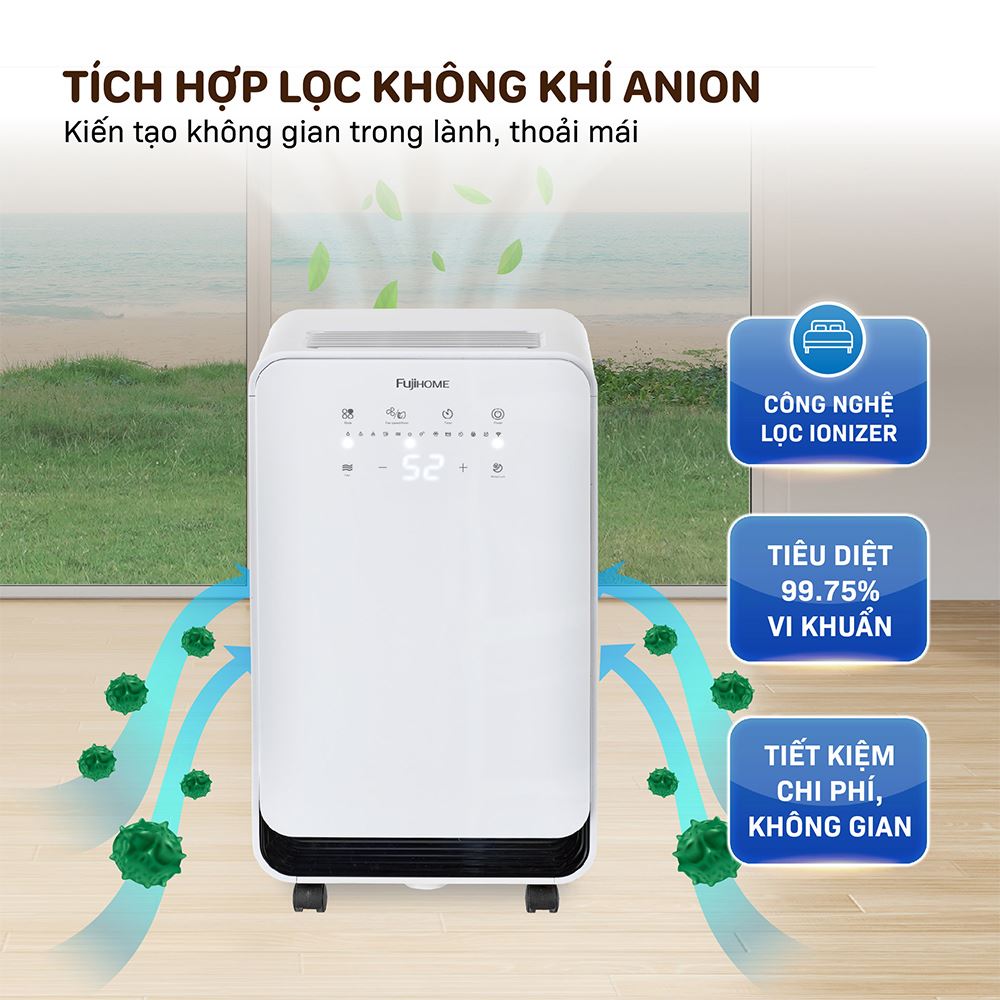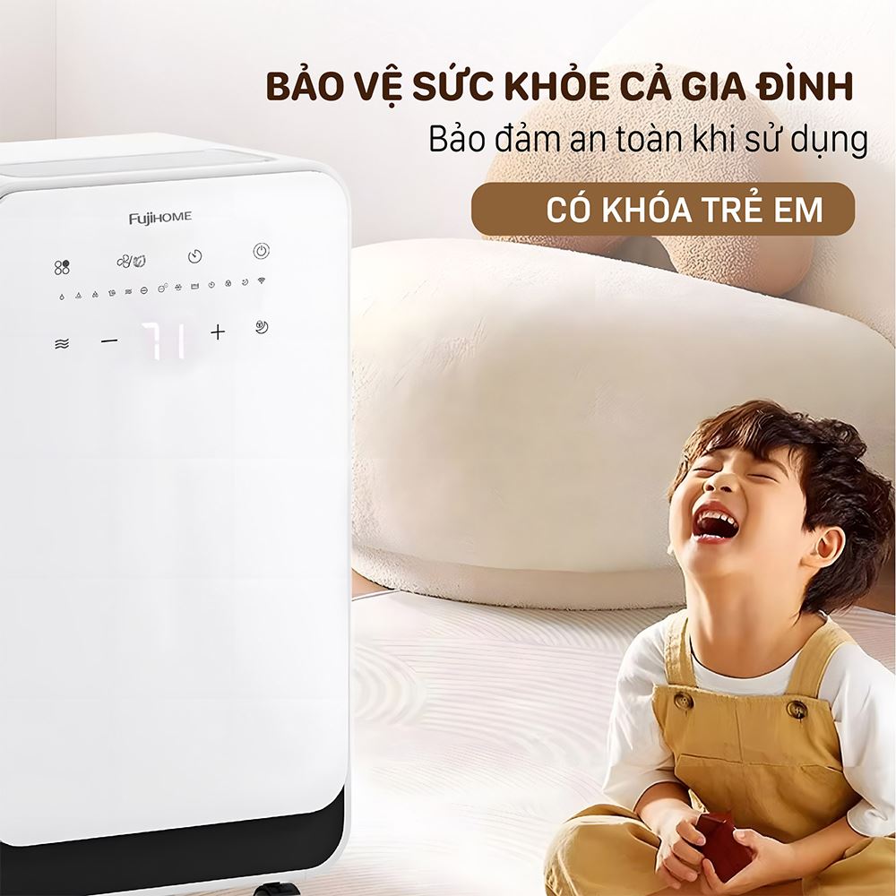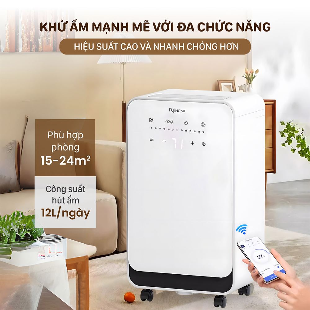 Tóm lại, FUJIHOME DH12NEW là lựa chọn lý tưởng cho những ai đang tìm kiếm một chiếc máy hút ẩm đa năng, hiệu quả và hiện đại. Với công suất hút ẩm 12 lít/ngày, khả năng lọc không khí Anion, dung tích bình chứa 2.2 lít và độ ồn thấp, sản phẩm này phù hợp cho các gia đình, văn phòng hay bất kỳ không gian từ 15- 24m² cần kiểm soát độ ẩm và cải thiện chất lượng không khí.