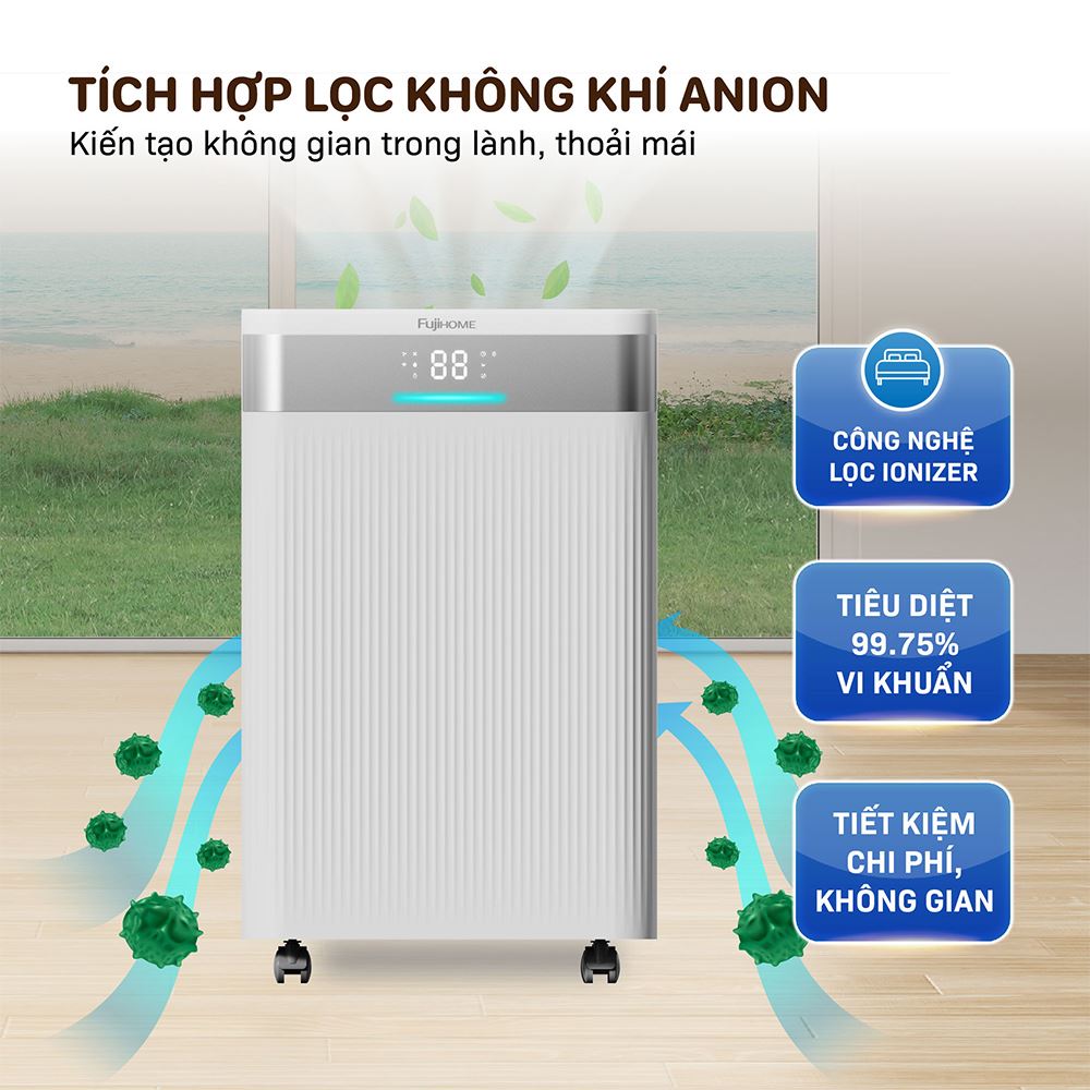 Chiếc máy hút ẩm FUJIHOME DH16NW-HEPA sở hữu công nghệ hút ẩm tiên tiến kết hợp lọc không khí Anion giúp tiêu diệt tới 99.75% vi khuẩn gây hại, mang lại bầu không khí trong lành, bảo vệ sức khỏe cho cả gia đình.