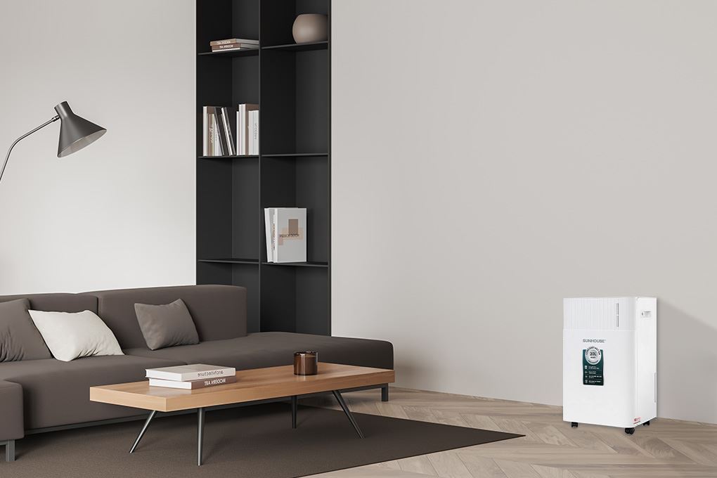 Máy hút ẩm Sunhouse vận hành theo cơ chế hút không khí ẩm từ môi trường vào bên trong, sau đó làm lạnh để hơi nước ngưng tụ thành giọt và chảy xuống bình chứa. Phần không khí sau khi tách ẩm được làm ấm nhẹ rồi đưa trở lại phòng, giúp duy trì không gian khô thoáng, giảm cảm giác ẩm bí và hạn chế nấm mốc phát sinh trong điều kiện thời tiết nồm ẩm.