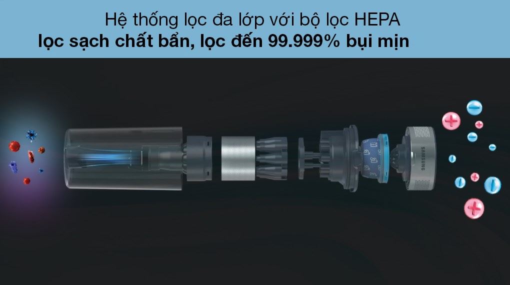 Samsung VS15A6031R1/SV trang bị hệ thống hút đa lốc xoáy Jet Cyclone tạo ra lực hút mạnh vượt trội qua 9 trục hút xoáy và 27 cửa hút gió, giảm thiểu lực hút hao hụt. Công nghệ Jet Cyclone còn có tác dụng lọc bụi mịn hiệu quả, trả lại không khí sạch cho ngôi nhà bạn tối ưu.