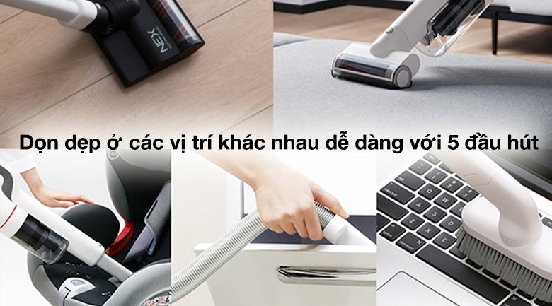Đầu hút khe để làm sạch khe kẽ hở, đầu hút bàn chải có thể làm sạch bàn phím, mặt bàn,...