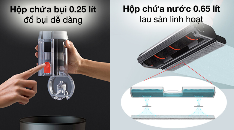 Mặt khác, hệ thống lau được gắn trực tiếp vào phía sau máng hút (đầu hút sàn) với 1 bình nước được cấu tạo có 2 lỗ thẩm thấu cung cấp nước cho miếng lau phía dưới cho quá trình lau sàn mượt mà, làm sạch các vết bẩn tối ưu, có thể dùng kèm nước lau sàn nếu muốn.