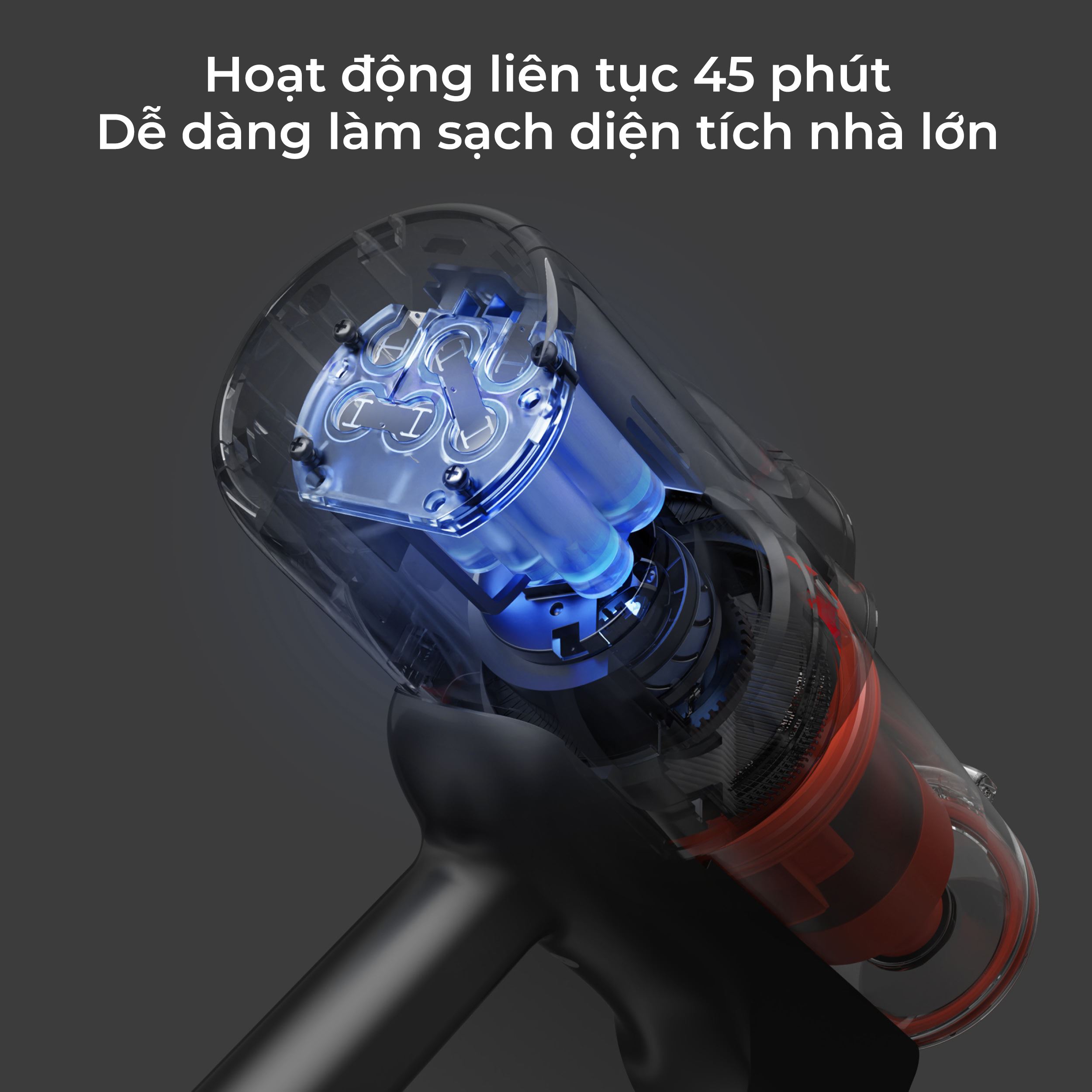 Động cơ con lăn độc lập trên đầu hút sàn cùng ánh sáng xanh quang học giúp phát hiện bụi hiệu quả. Pin 2500mAh cho 45 phút sử dụng sau 5.5 giờ sạc. Hộp chứa bụi 0.56 lít dễ dàng đổ chỉ với 1 nút nhấn.