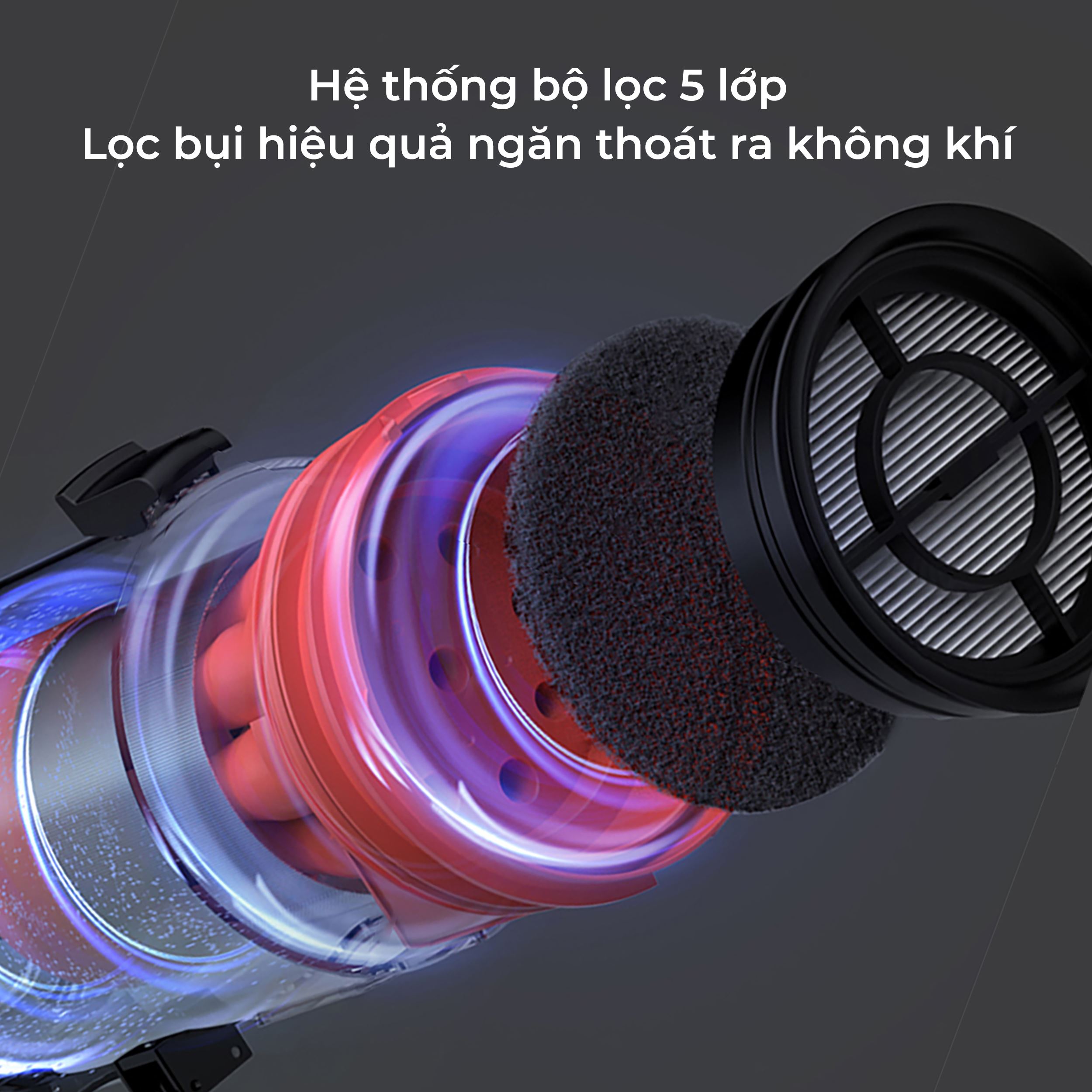 Sản phẩm sở hữu hệ thống lọc 5 lớp giúp lọc sạch bụi và tác nhân gây dị ứng. Máy hoạt động với độ ồn dưới 82dB, mang lại không gian tương đối yên tĩnh khi dọn dẹp.