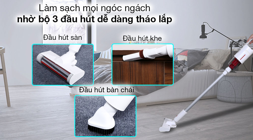 Đi kèm nhiều phụ kiện như: Ống nối, đầu hút sàn, hút khe, bàn chải, củ sạc hỗ trợ người dùng tốt hơn trong việc dọn dẹp vệ sinh ở nhiều vị trí một cách dễ dàng