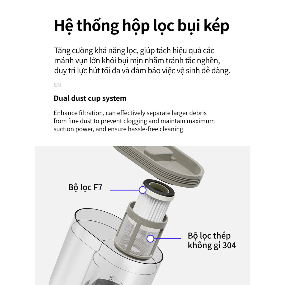 Thiết bị này sở hữu hệ thống lọc bụi kép tiên tiến, bao gồm bộ lọc thép không gỉ 304 và bộ lọc F7, giúp tách biệt hiệu quả các mảnh vụn lớn khỏi bụi mịn. Điều này không chỉ duy trì lực hút tối đa mà còn tránh tắc nghẽn, kéo dài tuổi thọ máy. Với dung tích túi chứa 0.5 lít, bạn có thể thoải mái làm sạch mà không cần đổ bụi quá thường xuyên. Bộ lọc có thể tháo rời và rửa sạch dễ dàng, đảm bảo vệ sinh, thuận tiện cho việc bảo dưỡng lâu dài. Việc vệ sinh máy máy hút bụi trở nên đơn giản hơn bao giờ hết.
