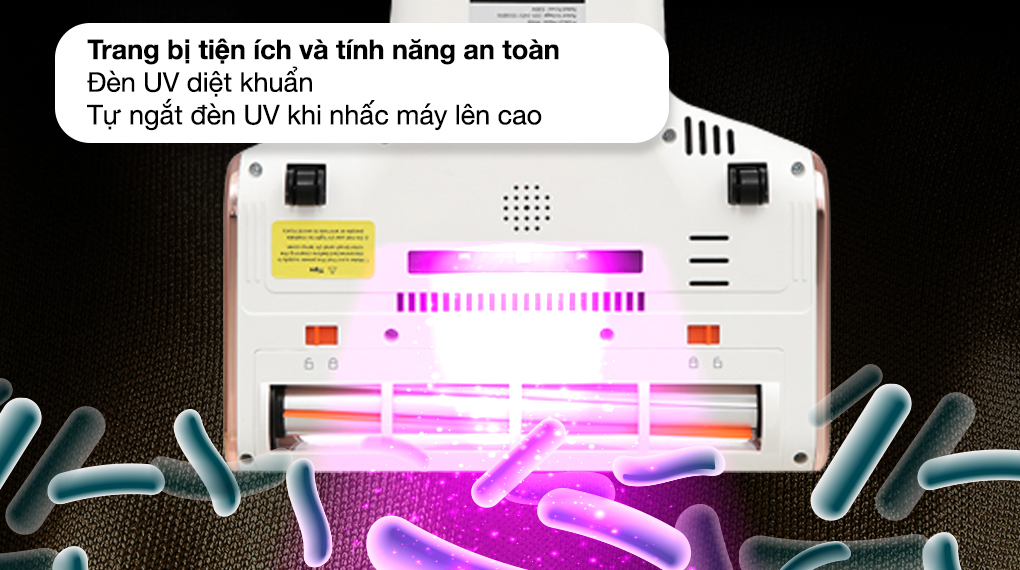 - Sử dụng đèn diệt khuẩn bằng tia UV, giúp ức chế sự phát triển vi khuẩn, mạt bụi cũng như các tác nhân gây dị ứng, nhờ đó bảo vệ sức khỏe làn da, hệ hô hấp của bạn và gia đình được tốt hơn. Bên cạnh đó, máy cũng sẽ tự tắt đèn UV khi nhấc máy lên cao, an toàn khi sử dụng.