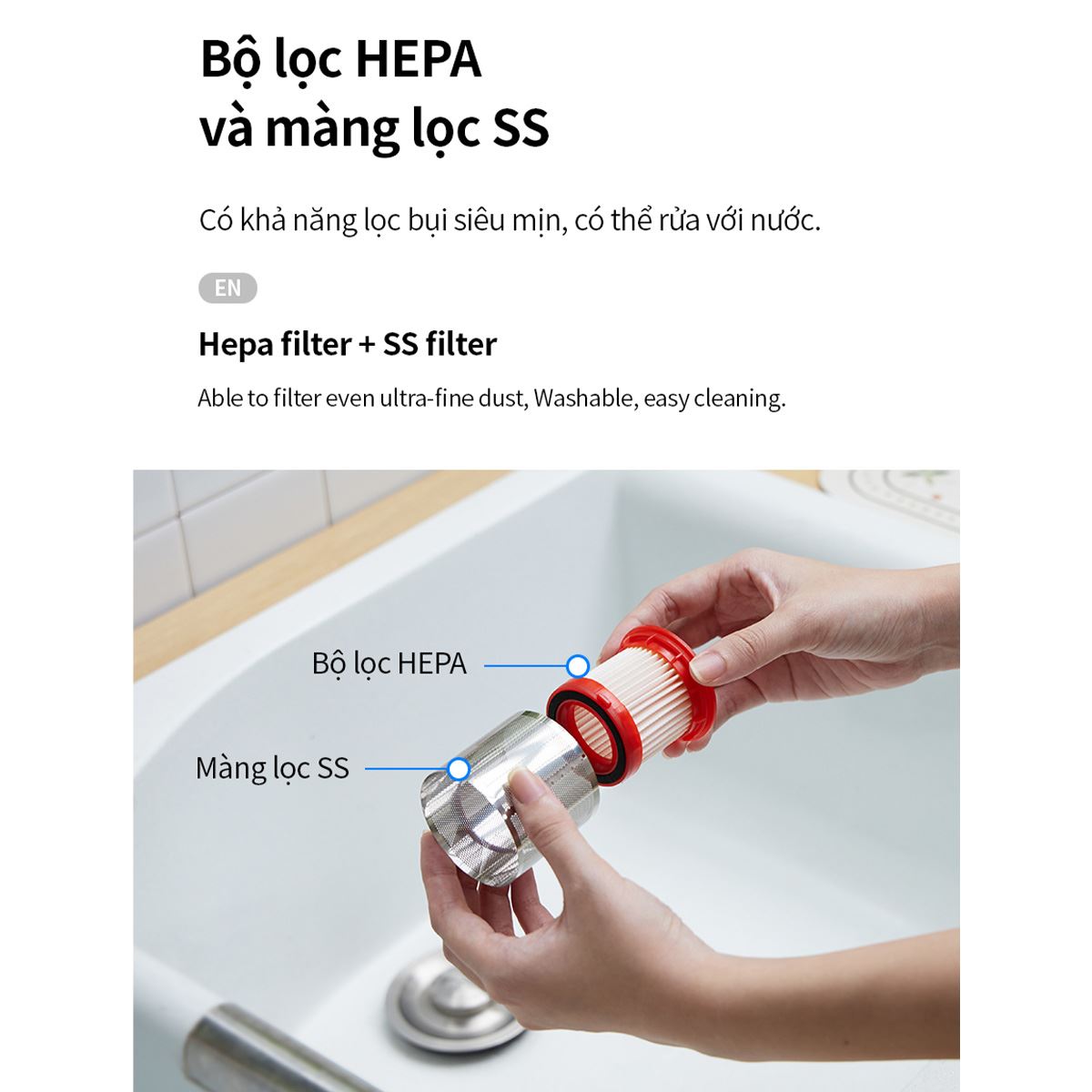 Máy hút bụi Lock&Lock ENV136WHT được trang bị hệ thống lọc kép tiên tiến, bao gồm màng lọc SS và bộ lọc HEPA. Bộ lọc HEPA nổi tiếng với khả năng giữ lại đến 99.97% các hạt bụi siêu nhỏ có kích thước từ 0.3 micromet trở lên, bao gồm bụi mịn, phấn hoa, lông thú cưng và các tác nhân gây dị ứng. Điều này không chỉ giúp không gian nhà bạn sạch bụi mà còn lọc sạch không khí, mang lại môi trường sống trong lành và an toàn hơn cho sức khỏe gia đình.