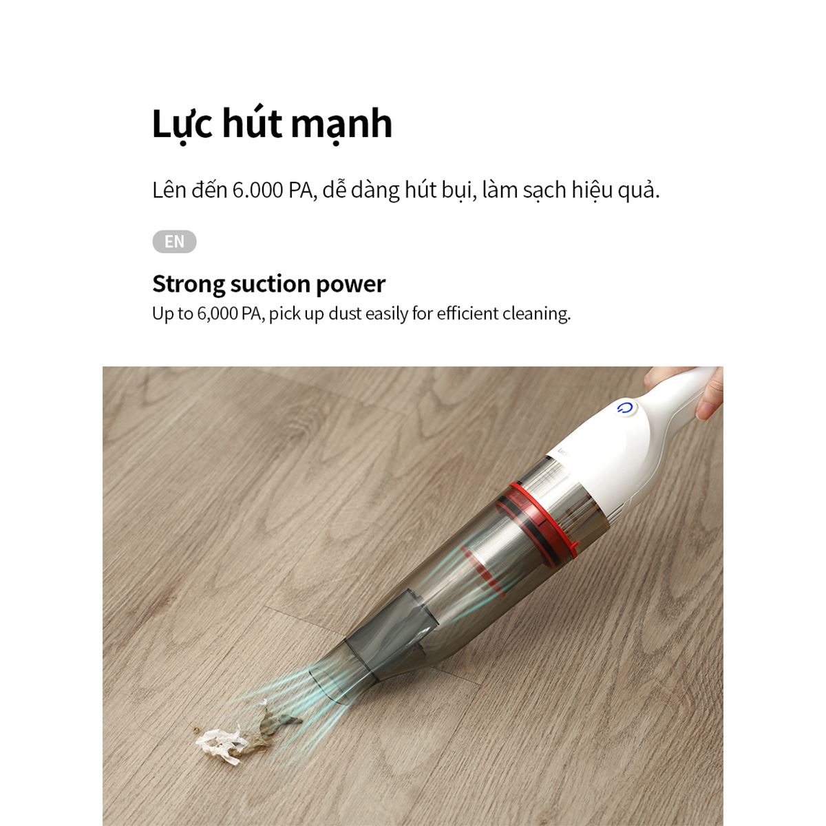 Với công suất hoạt động 75W và lực hút mạnh mẽ lên đến 6000 Pa, chiếc máy hút bụi này dễ dàng loại bỏ mọi loại bụi bẩn, vụn thức ăn hay lông thú cưng trên nhiều bề mặt khác nhau. Máy còn được trang bị 2 mức lực hút linh hoạt, cho phép người dùng điều chỉnh phù hợp với từng loại rác bẩn và nhu cầu dọn dẹp cụ thể, từ hút nhẹ nhàng bụi mịn đến xử lý các hạt bụi lớn hơn.