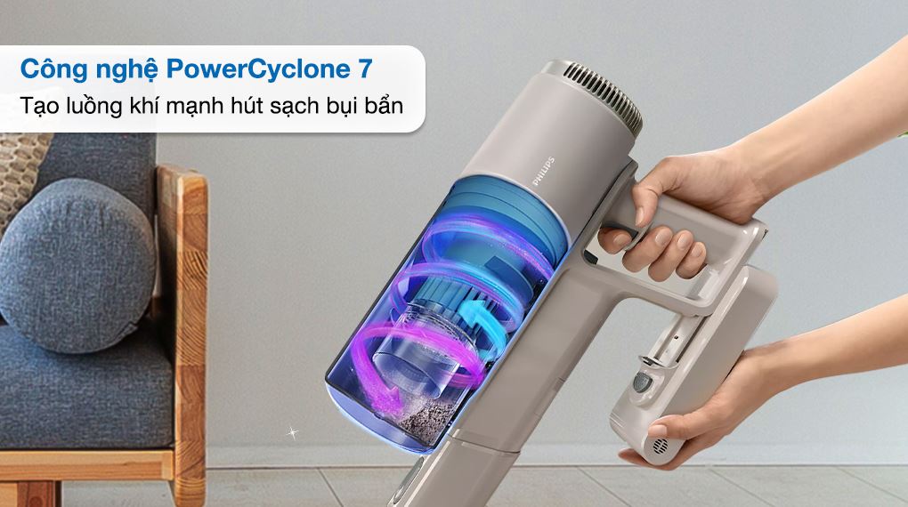 - Máy hút bụi không dây ứng dụng công nghệ PowerCyclone 7 tạo luồng khí mạnh lên đến 660 lít/phút với mức sử dụng pin tối thiểu. Lực hút mạnh mẽ giúp hút sạch bụi bẩn triệt để, đặc biệt là ở trên sàn cứng.