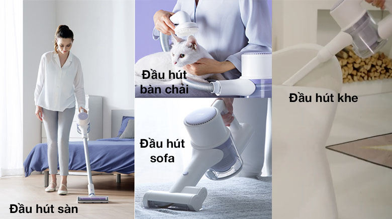 4 đầu hút: đầu hút sofa, đầu hút sàn, đầu hút bàn chải và đầu hút khe giúp làm sạch mọi ngóc ngách