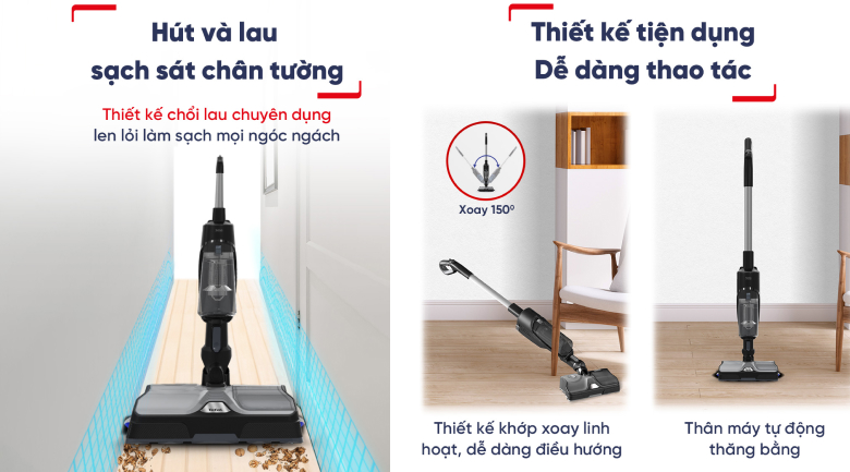 - Trang bị 1 đầu lau hút vừa hút bụi, vừa lau sàn tiện lợi, thiết kế xoay linh hoạt giúp dọn dẹp hiệu quả các chân ghế, cạnh tủ,...