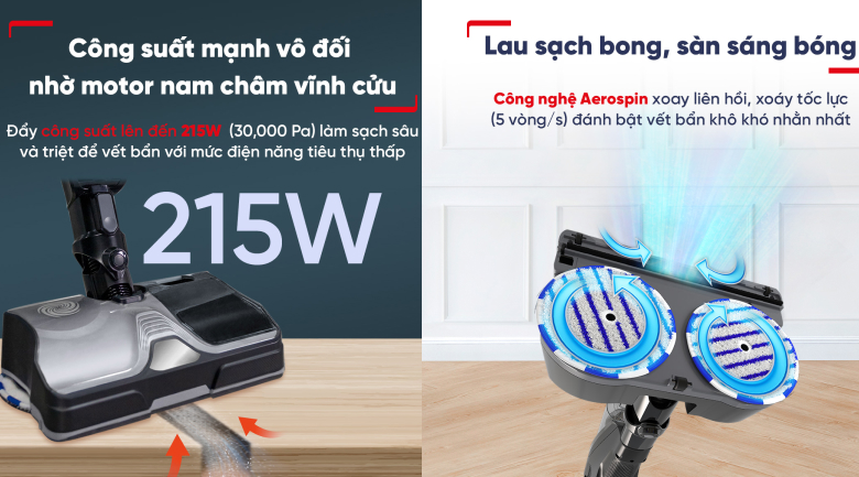 - Máy hút bụi không dây có công suất hoạt động 215W, cùng lực hút 30W giúp loại bỏ nhiều loại vết bẩn trên sàn nhà một cách nhanh chóng.