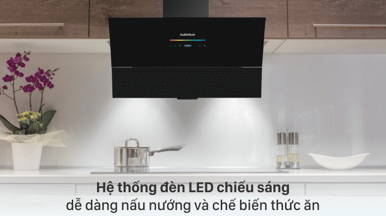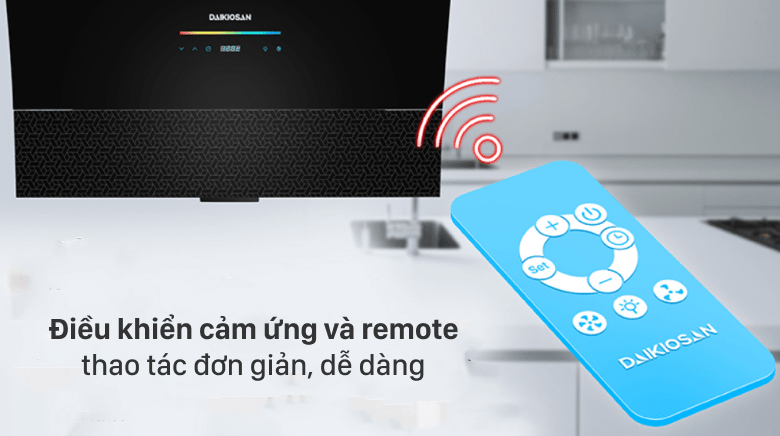 Máy hút mùi áp tường Daikiosan DKH-000003 điều khiển cảm ứng và remote, mặt kính sang trọng, công suất lớn, chất liệu bền bỉ, hút mùi hiệu quả, mang lại trải nghiệm tích cực cho người dùng.