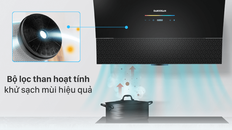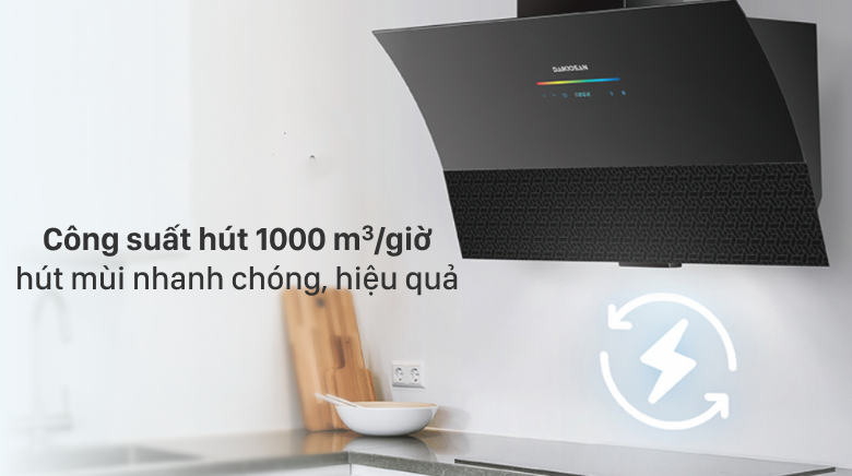 Máy hút mùi Daikiosan có công suất hoạt động 183W cho lực hút 1000 m3/giờ với 2 tốc độ khử mùi, giúp loại bỏ mùi thức ăn, khói đun nấu trong căn bếp một cách hiệu quả, trả lại cho bạn không gian bếp sạch sẽ, trong lành.