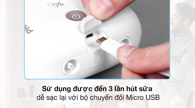 Pin có thể sạc lại để hút sữa khi đang di chuyển, đi kèm với bộ chuyển đổi Micro USB.