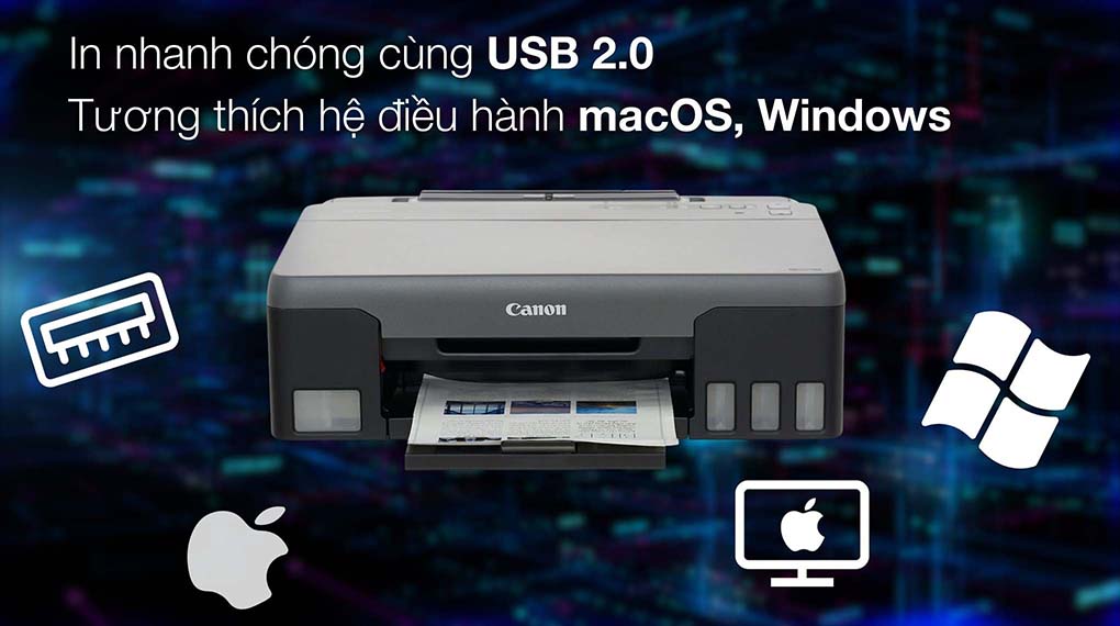 Với cổng kết nối USB 2.0, bạn có thể kết nối máy in PIXMA G1020 với máy tính hoặc thiết bị di động một cách nhanh chóng và ổn định. PIXMA G1020 tương thích với nhiều hệ điều hành phổ biến, bao gồm Windows 7, Windows 8.1, Windows 10, macOS 10.15 Catalina và macOS Sierra (10.12).